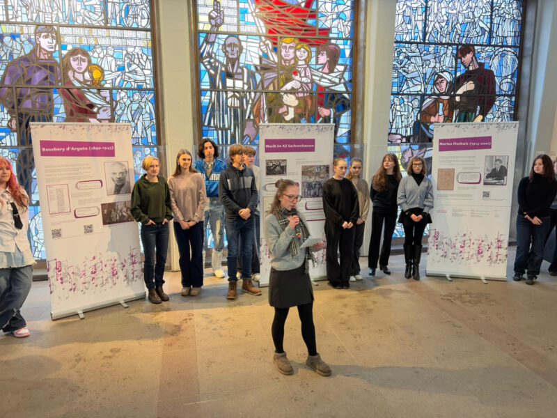 Auch dieses Jahr frischten wir zu Beginn unsere Kenntnisse über die Zeit des Nationalsozialismus aus dem Geschichtsunterricht auf. Dabei befassten wir uns mit der Täter- und der Opferperspektive und bereiteten uns auf die Gedenkveranstaltung in der Gedenkstätte Sachsenhausen am 27. Januar vor. Mit der Landtagspräsidentin Frau Ulrike Liedtke sprachen wir über das Gedenken an die NS-Zeit, die Veranstaltung sowie eine Ausstellung, die wir im Laufe der letzten Wochen erstellt hatten. Im Fokus dieser Ausstellung stehen die Musik im KZ mit ihrem Missbrauch und ihrer Wirkung sowie die zwei Musiker und Komponisten Martin Rosebery d‘Arguto und Marius Flothuis. Bei dem sich anschließenden Gedenkkonzert am Abend wurden auch ihre Stücke gespielt.